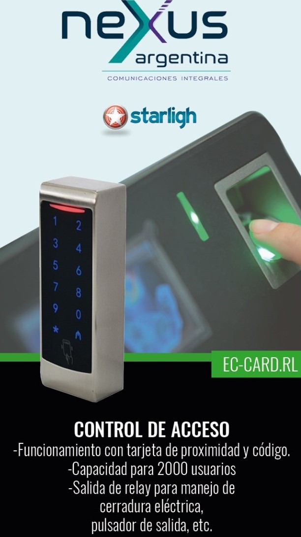 Este equipo de control de accesos por tarjeta de proximidad permite restringir el acceso a determinados espacios mediante una cerradura que sólo se activa con la tarjeta o el código correcto. Una vez comprobada la identidad del usuario, un relay acciona un pestillo eléctrico o cerradura magnética para permitir el ingreso/salida. Este modelo no posee software de control de horarios.